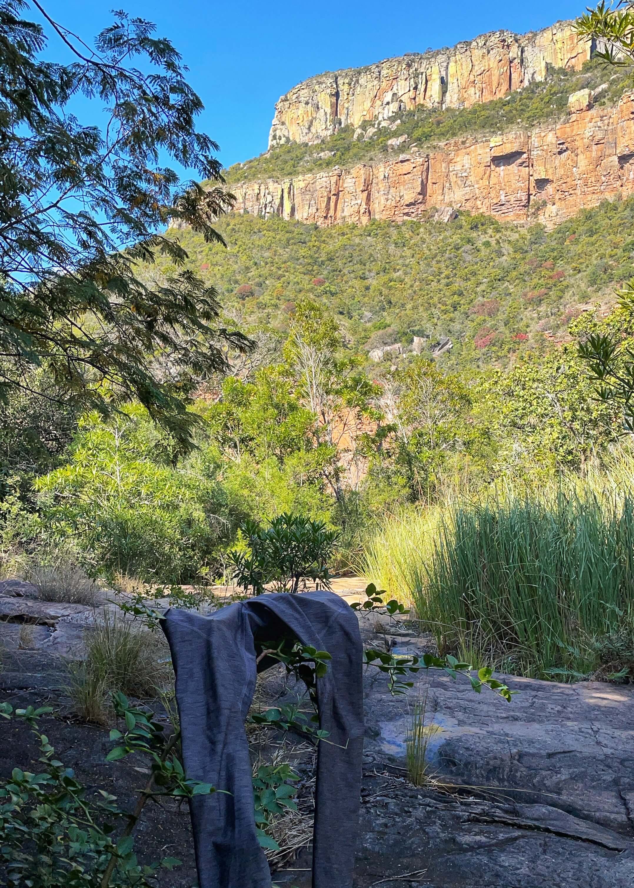 Pitching my tent at a hostel in South Africa (left). An American girl at the hostel left a pair of leggings behind on a waterfall hike. They became a cherished item in my kit (right).
